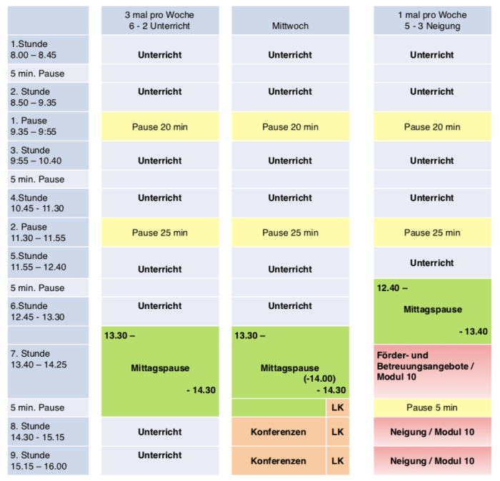 Der Ganztag findet von 8 bis 16 Uhr statt. Sechs Unterrichtsstunden liegen vor der einstündigen Mittagspause, zwei Stunden danach. Alle Unterrichtsstunden dauern 45 Minuten und sind größtenteils in neunzigminütigen Doppelstunden angelegt, also ein Fach pro Stundenblock.