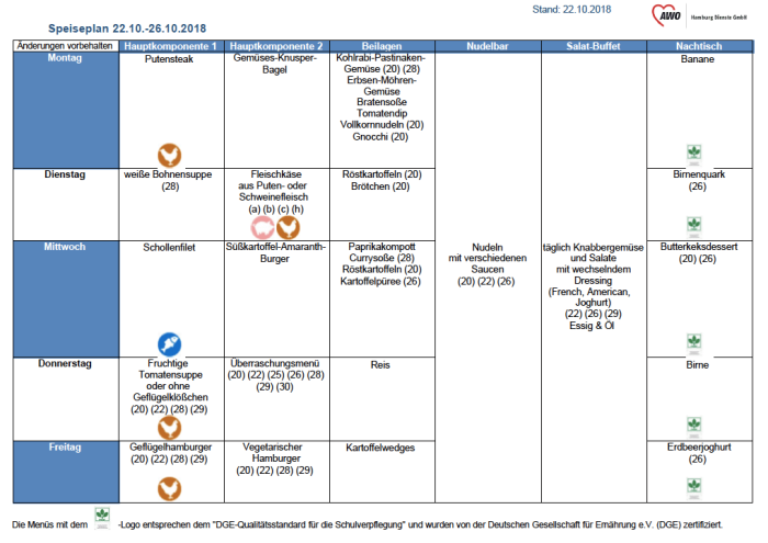 Die Schülerinnen und Schüler haben von 13.30 bis 14.30 die Gelegenheit ein warmes, frisch zubereitetes Mittagessen in der Mensa einzunehmen, vor den Neigungskursnachmittagen bereits um 12.45 Uhr. Das Mittagessen beinhaltet eine Salatbeilage, die sich die Schüler selber am Salatbuffet zusammenstellen können