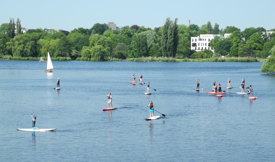 Weil wir während unserer Besuche in den anderen Ländern so herzliche Gastfreundschaft erfahren hatten, wollten wir unser Hamburg-Treffen zu einer besonderen Woche machen – und das ist uns auch gelungen. Selbst das Wetter spielte fast die ganze Zeit mit, so dass das Stand-up-Paddling auf der Alster ebenso viel Spaß machte wie das Kanufahren auf dem Salemer-See und dem Pipersee oder unser Picknick im Jenisch-Park mit herrlichem Ausblick auf die Elbe.