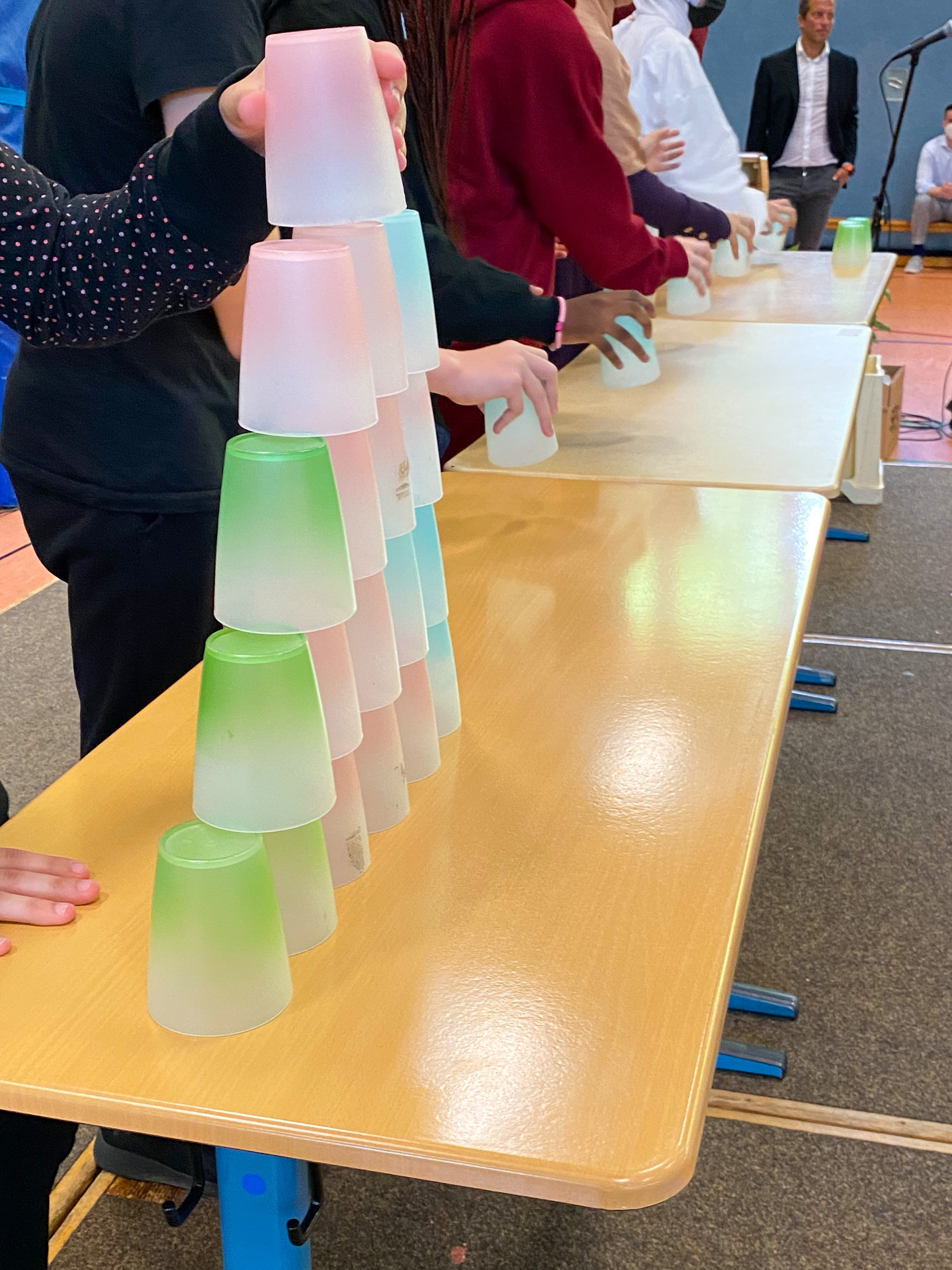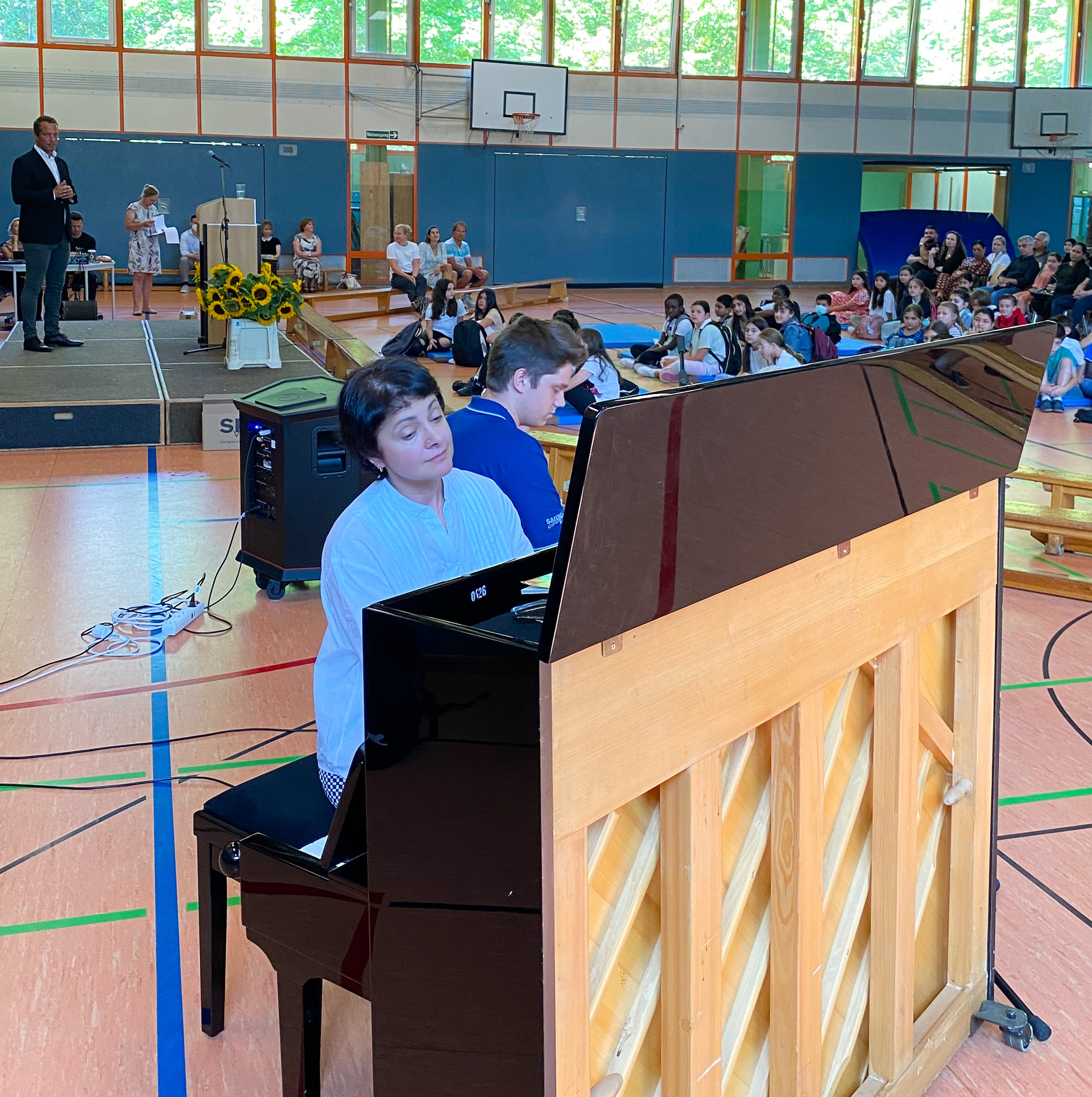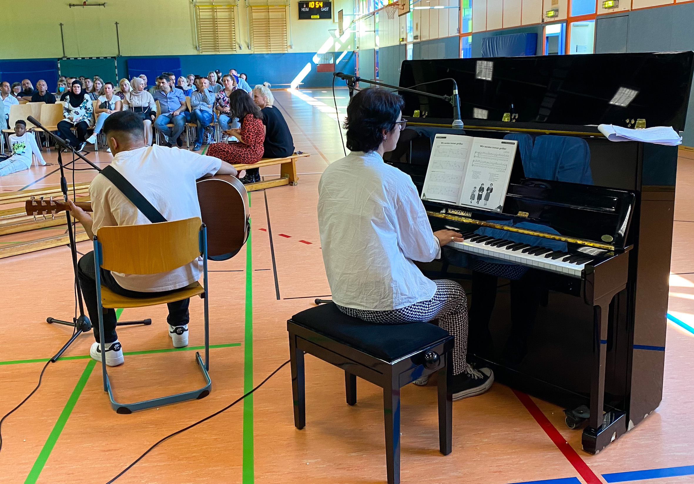 Begleitet wurden die Einschulungsfeier auch wieder von wunderschönen musikalischen Untermalungen unserer Leitung des Fachbereichs Musik, Frau Ketevan Fankhänel, sowie von unseren Schülern Zeil aus Jahrgang 11 und Maksim aus der internationalen Vorbereitungsklasse. Auch die Cup-Song-Einlage einer Schülergruppe aus Jahrgang 7 mit gesanglicher Untermalung von Frau Miriam Liegner war ein weiteres Highlight der Veranstaltung. Wir danken ganz herzlich für die gelungenen Darbietungen!