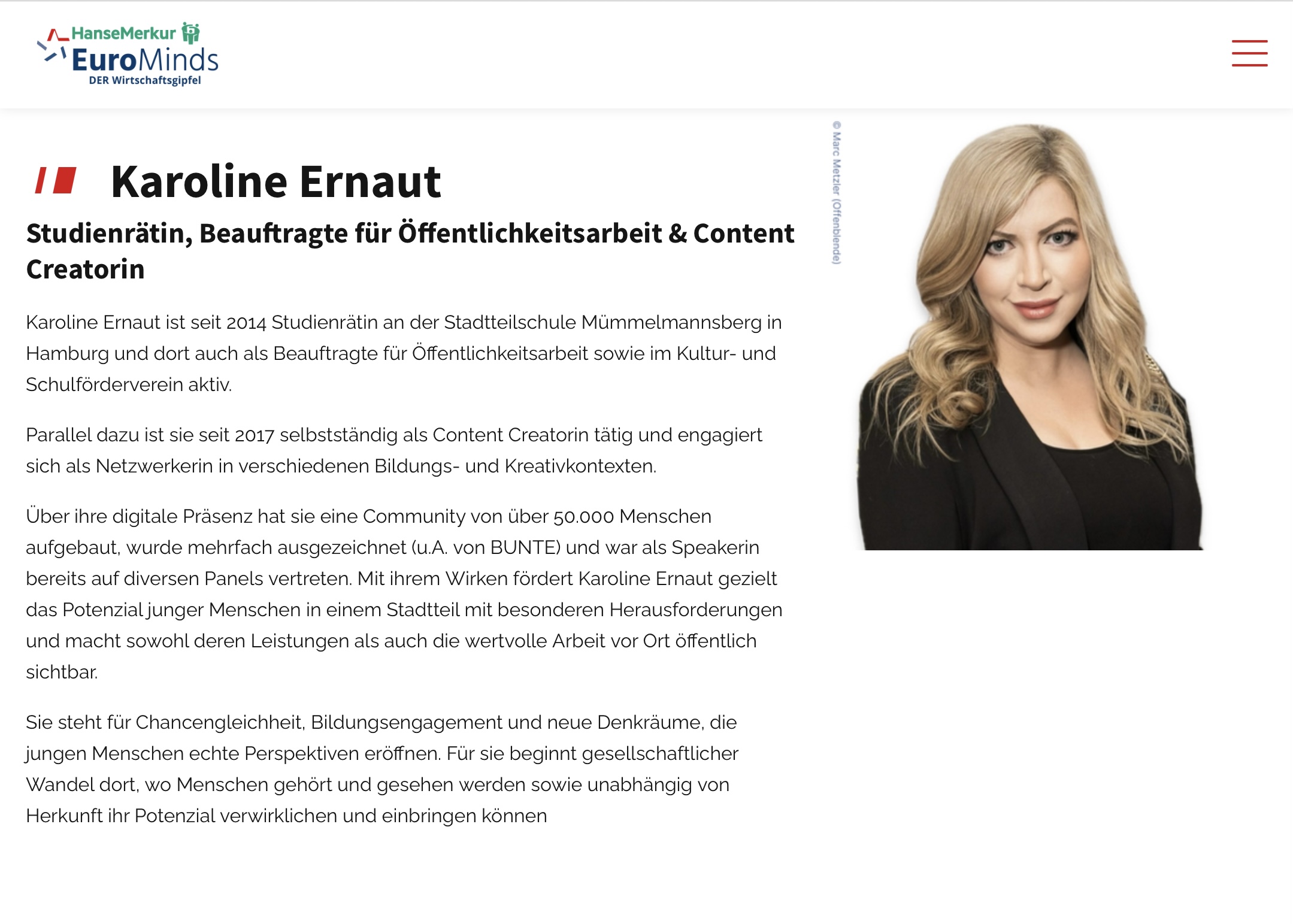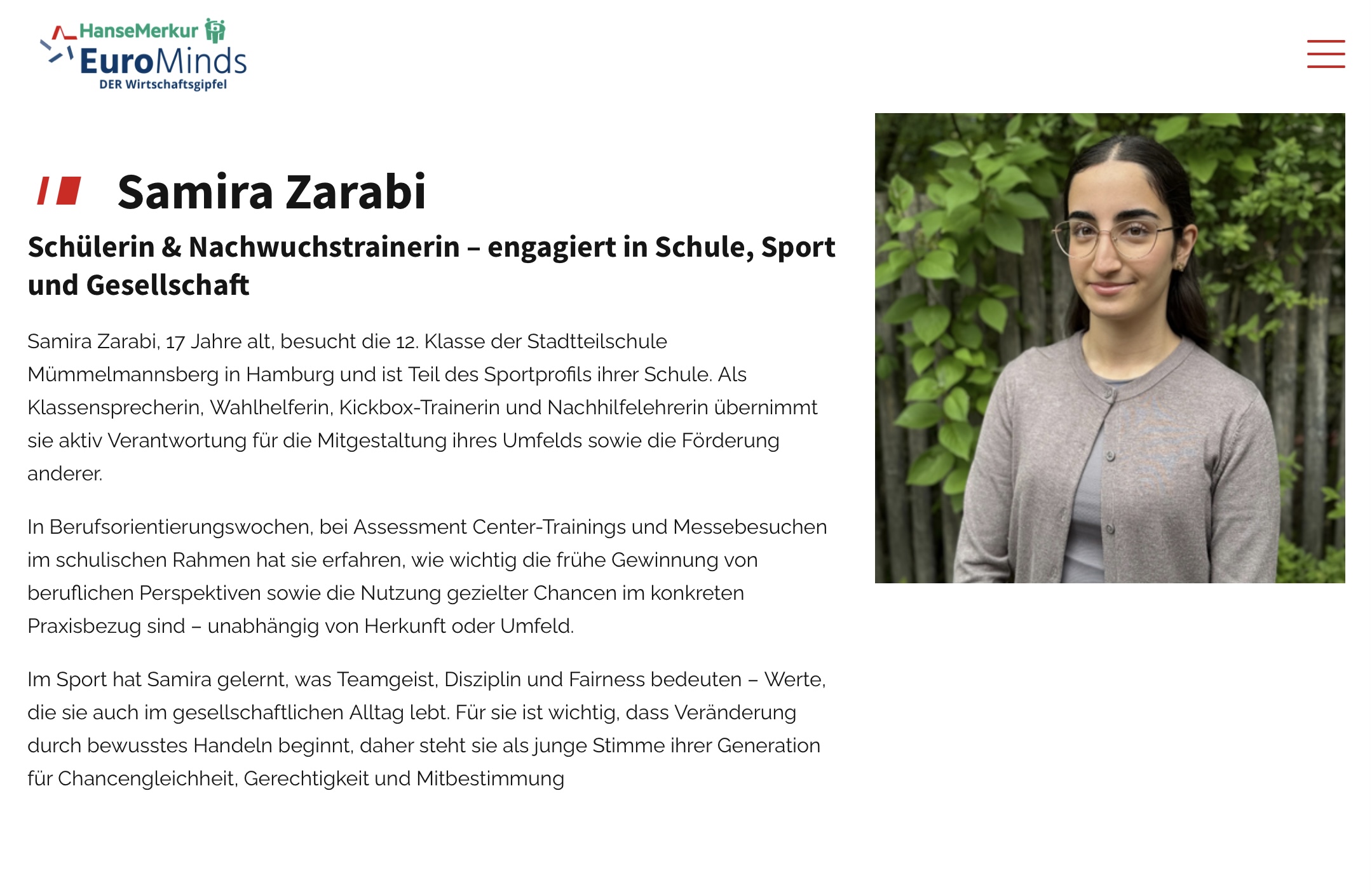 Zu diesen Fragen wurde sich in unserer Masterclass im Rahmen des HanseMerkur-EuroMinds-Wirtschaftsgipfels 2025 ausgetauscht, an der unsere engagierte Schülerin Samira Zarabi (12a, Nachwuchstrainerin, Wahlhelferin, Nachhilfelehrerin) gemeinsam mit ihrer Tutorin Karoline Ernaut (Studienrätin, Beauftragte für Öffentlichkeitsarbeit & Content Creatorin) teilgenommen hat - weitere Informationen zu den beiden Teilnehmerinnen unserer Schule sind am Ende dieses Artikels zu finden.