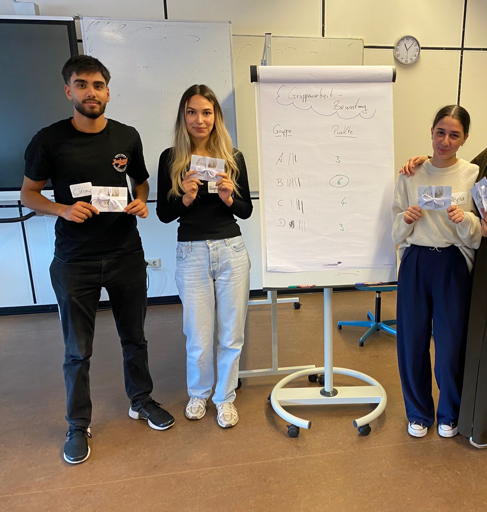Als Nächstes durfte sich die Klasse der Team Challenge stellen: Vier Gruppen arbeiteten an eigenen Finanzkonzepten und Business-Ideen, die sie anschließend kreativ auf Flipcharts präsentierten. Die Präsentationen wurden durch eine gegenseitige Punktevergabe bewertet – Eigenbewertungen waren ausgeschlossen.