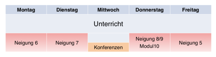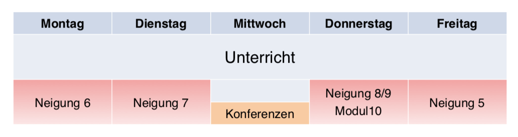 Der Ganztagsbetrieb findet an vier Tagen in der Woche statt. Der Mittwochnachmittag ist für die Schülerinnen und Schüler unterrichtsfrei, das pädagogische Personal nimmt in dieser Zeit an Konferenzen, Teamsitzungen oder Fortbildungsveranstaltungen teil. Für die Schülerinnen und Schüler gibt es zu dieser Zeit ein zusätzliches Förderangebot in den Fächern Deutsch, Mathe und Englisch. In den Jahrgängen 5 bis 7 findet die Lernförderung in der Mittagspause vor dem Neigungsnachmittag statt, die an diesem Tag etwas länger ist. Die Lernförderung wird hier von Kollegen und Kolleginnen unserer Schule durchgeführt.