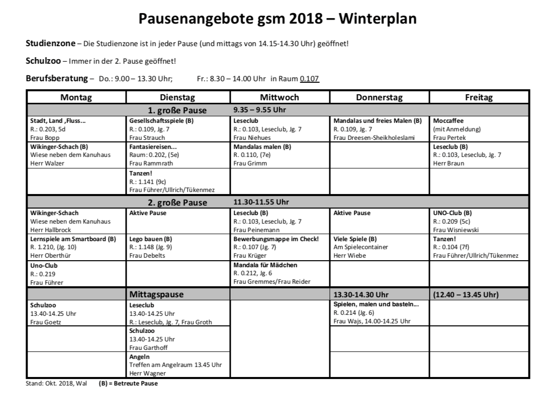 Die großen Pausen finden von 9.35 bis 9.55 Uhr und von 11.30 bis 11.55 statt. Die Mittagspause beginnt um 13.30 Uhr und endet um 14.30. Für die Schülerinnen und Schüler gibt es vielfältige Angebote:
