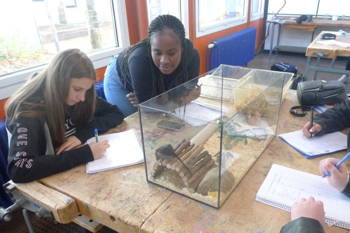 Nach einigen angeleiteten Experimenten, bei denen es vor allem darum ging, genaues Beobachten zu lernen (Wie frisst eine Maus eigentlich genau einen Sonnenblumenkern? Wo hält sich eine Maus am liebsten auf?) ging es für den Wahlpflichtkurs „Tierwerkstatt“ schon bald ans selbständige Experimentieren.