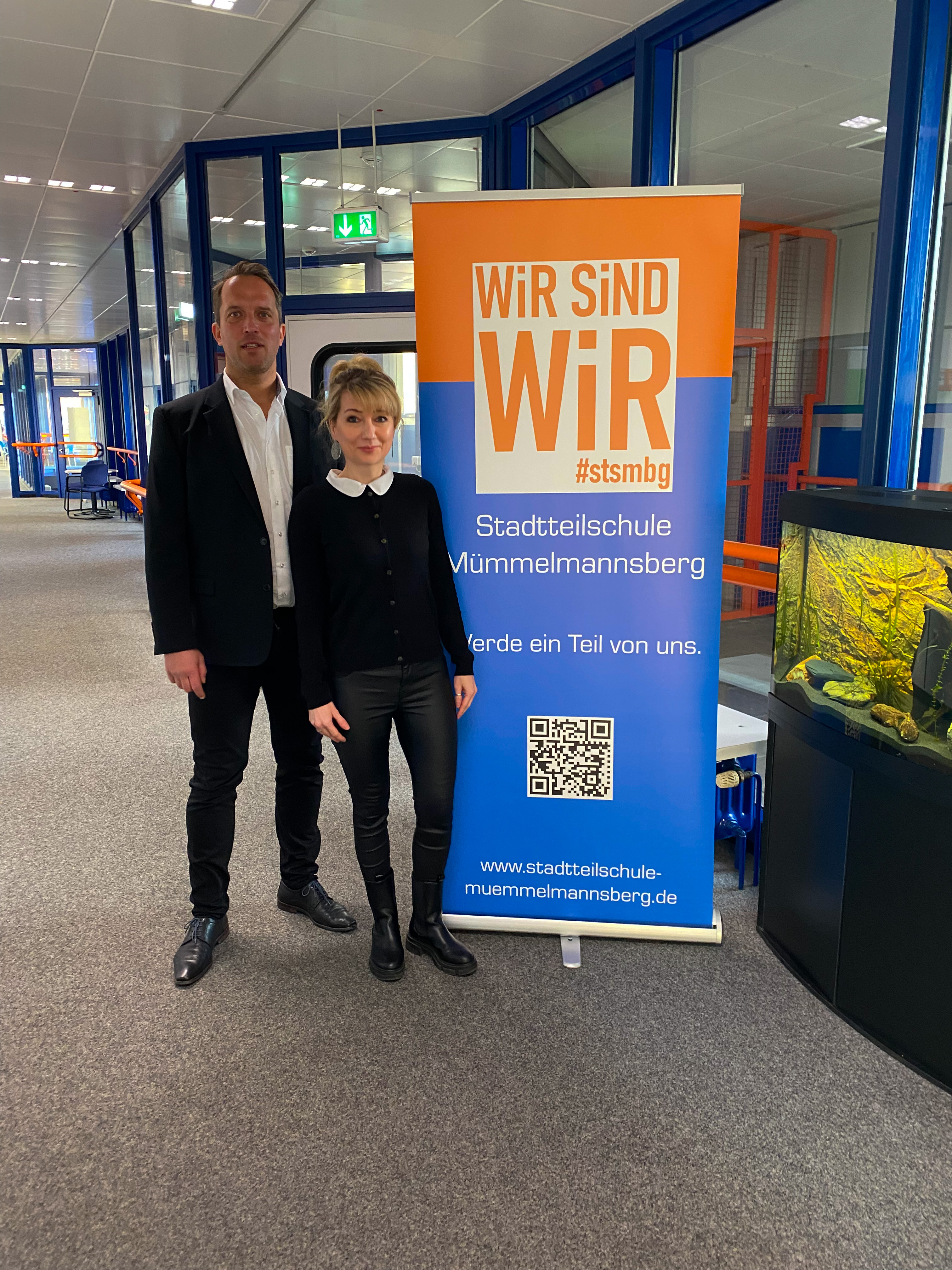 Unser Schulleiter, Herr Gernot Günther (links im Bild), unsere Didaktische Leiterin, Frau Manuela Meister (rechts im Bild), unsere Abteilungsleiterin Jahrgang 5-7, Frau Julia Omland sowie unser Förderkoordinator, Herr Clemens Walzer, repräsentieren im Rahmen des offenen Marktplatzes die Schulform "Stadtteilschule" in Hamburg - für alle, die mehr wollen!