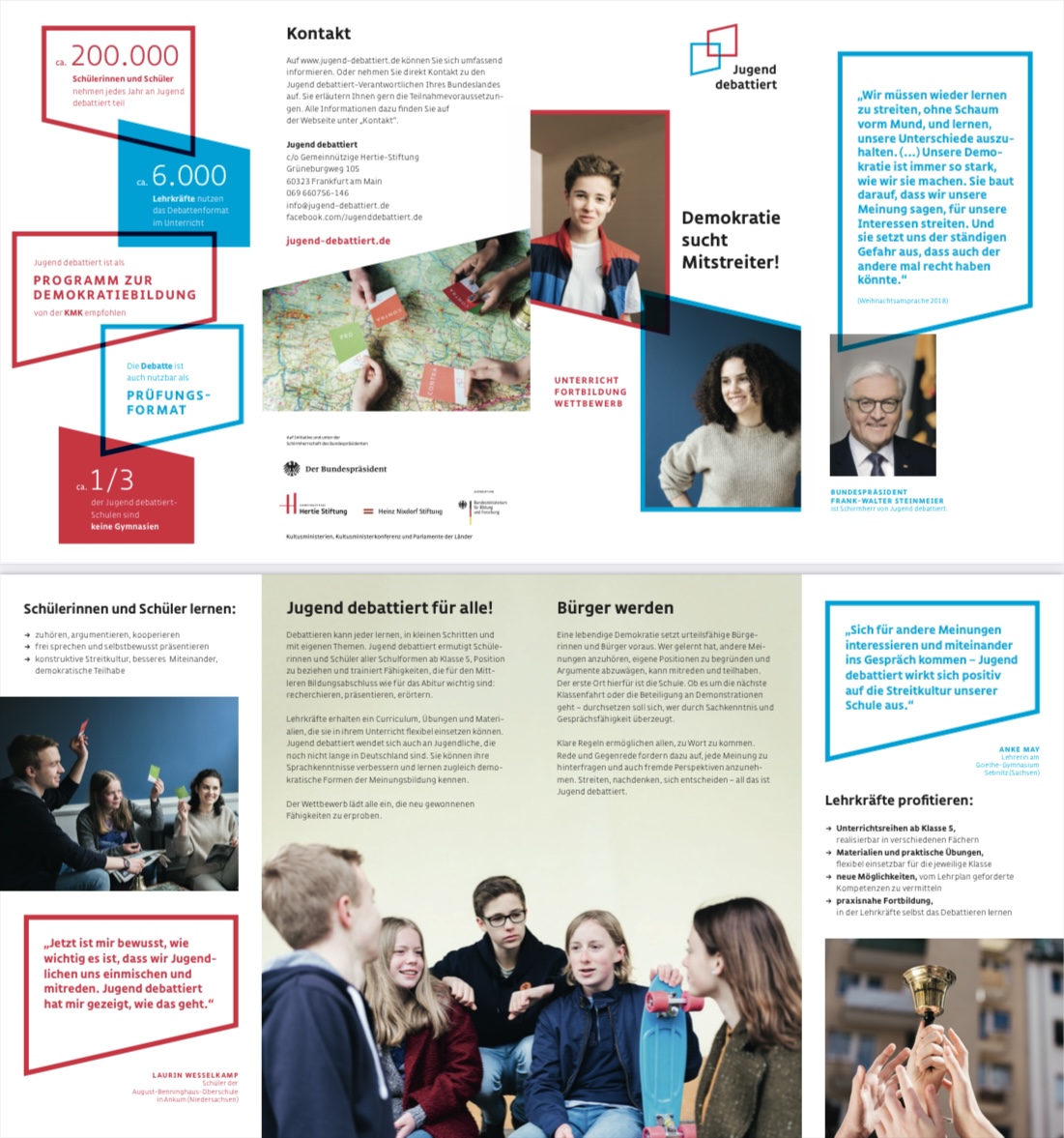"Eine Demokratie braucht Menschen, die kritische Fragen stellen. Menschen, die aufstehen, ihre Meinung sagen und sich mit den Meinungen anderer auseinandersetzen. Menschen, die zuhören und reden können. Menschen, die fair und sachlich debattieren." (https://www.jugend-debattiert-hamburg.de/)