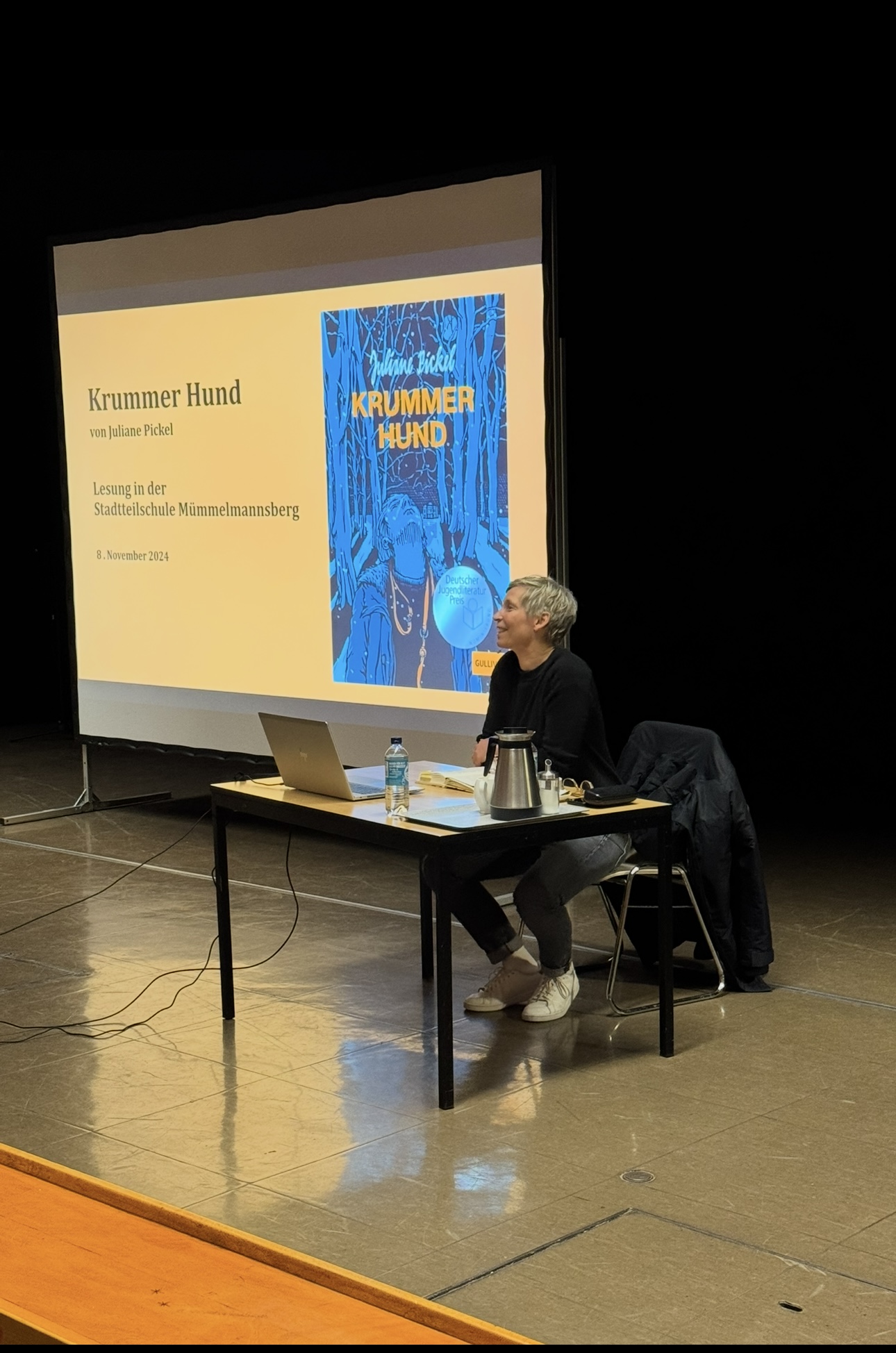 Frau Pickel las aus ihrem Werk „Krummer Hund“ vor und gab den Schülerinnen und Schülern zudem spannende Einblicke in die Inszenierung des Buchs am Theater im Marienbad in Freiburg.