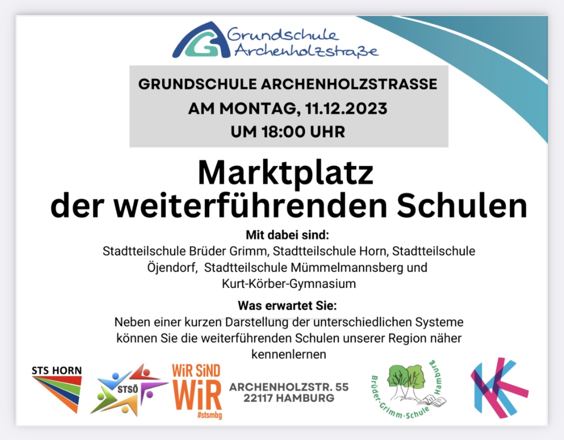 Am Montag, den 11.12.2023 findet um 18h ein Markplatz der weiterführenden Schulen statt und wir sind mit dabei!