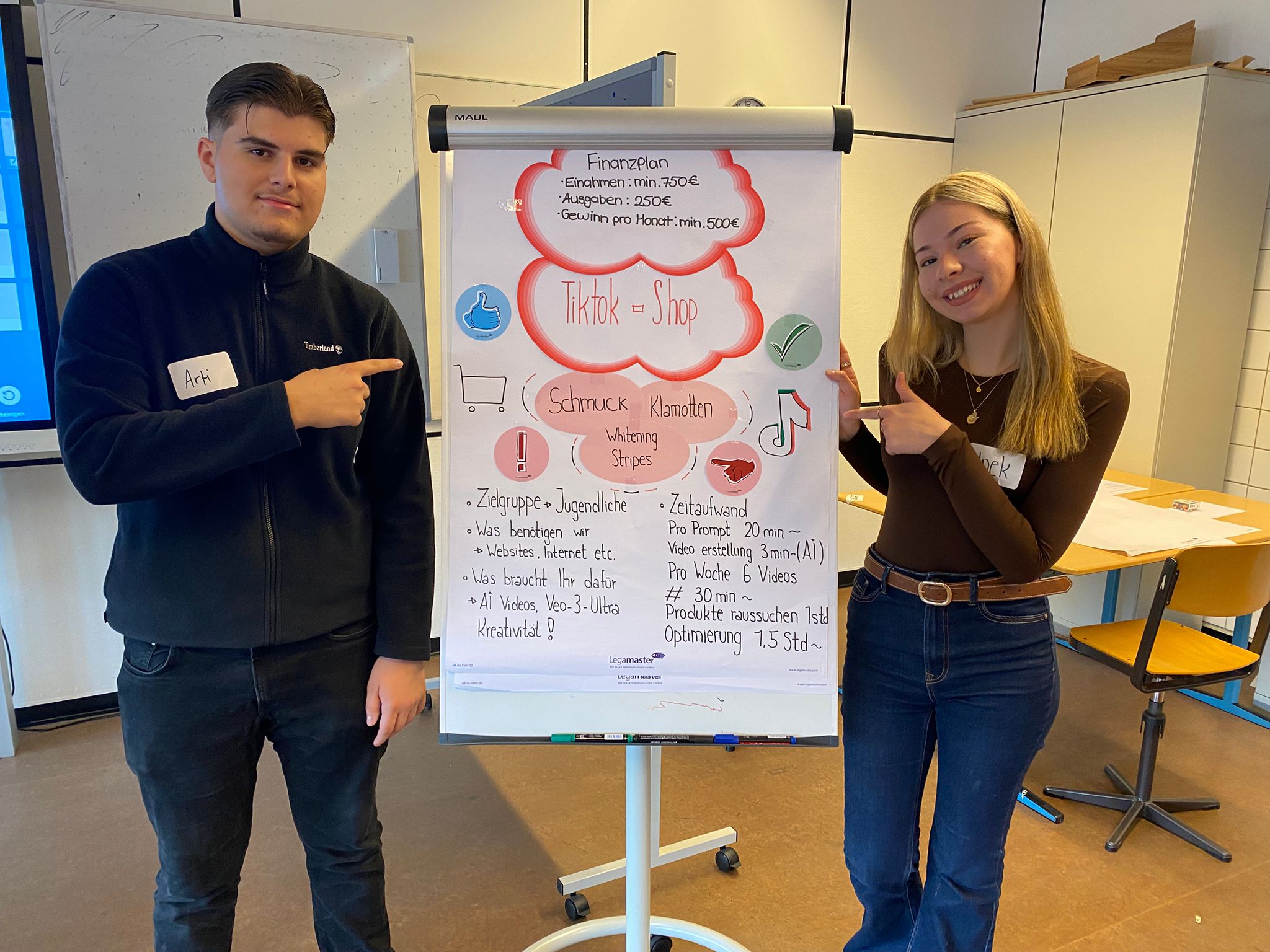 Als Nächstes durfte sich die Klasse der Team Challenge stellen: Vier Gruppen arbeiteten an eigenen Finanzkonzepten und Business-Ideen, die sie anschließend kreativ auf Flipcharts präsentierten. Die Präsentationen wurden durch eine gegenseitige Punktevergabe bewertet – Eigenbewertungen waren ausgeschlossen.